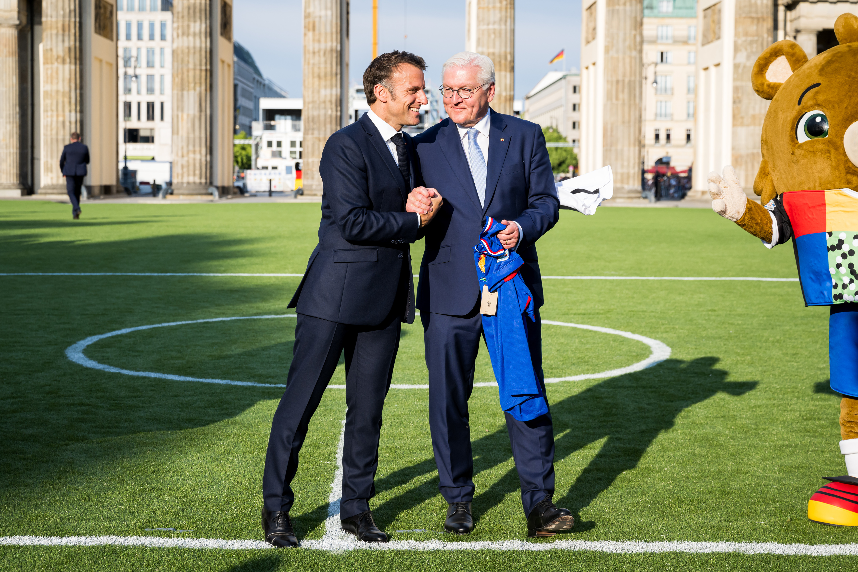 Staatspräsident von Frankreich Emmanuel Macron und Bundespräsident der Bundesrepublik Deutschland Frank-Walter Steinmeier beim EM Staatsbesuch am Brandenburger Tor am 26.05.2024 in Berlin, Deutschland.
