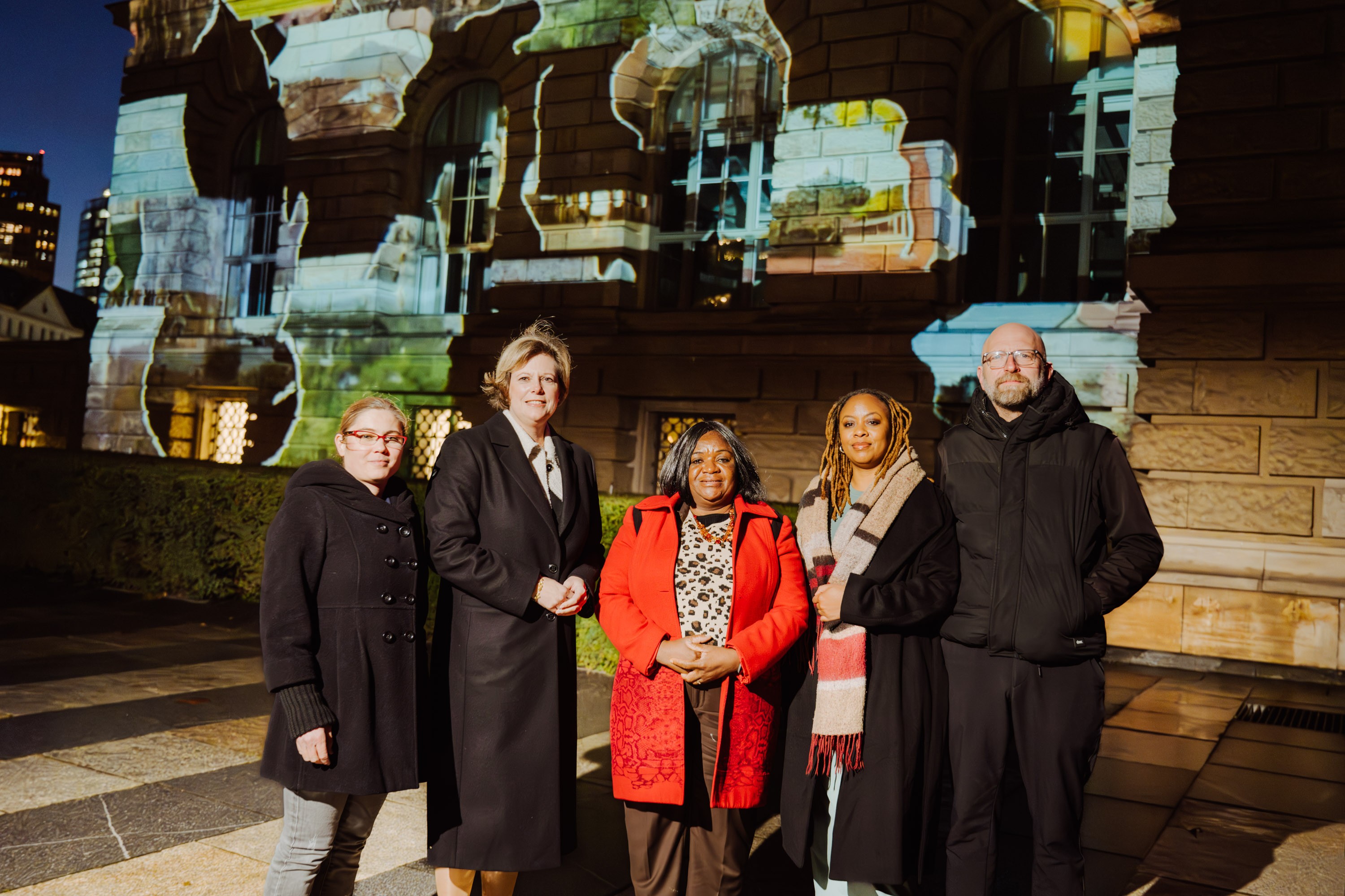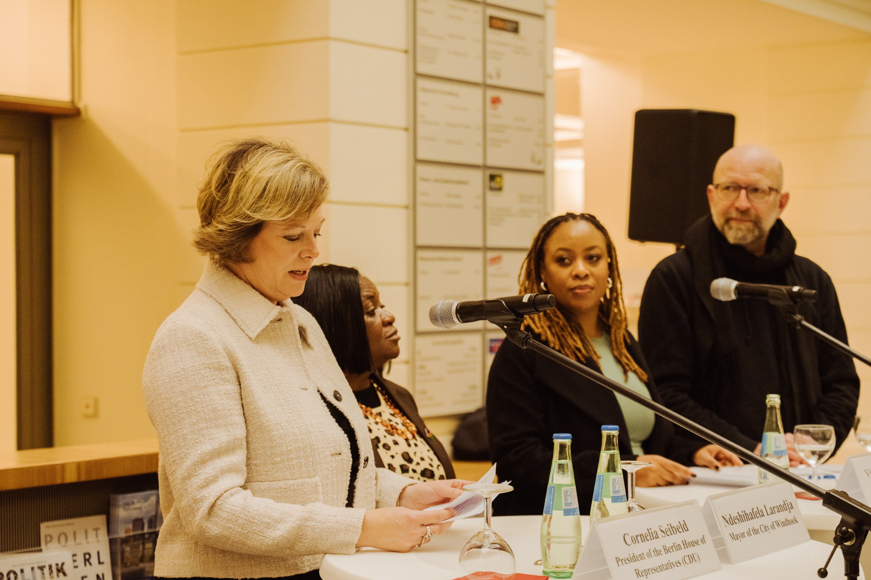 v.l.n.r.: Franziska Leschewitz (Mitglied des Abgeordnetenhauses), Cornelia Seibeld (Parlamentspräsidentin), Ndeshihafela Larandja (Bürgermeisterin Windhoek), Vitjitua Ndjiharine (Künstlerin), Moritz van Dülmen (Geschäftsführer Kulturprojekte Berlin); © Kulturprojekte Berlin, Foto: Anna Tiessen