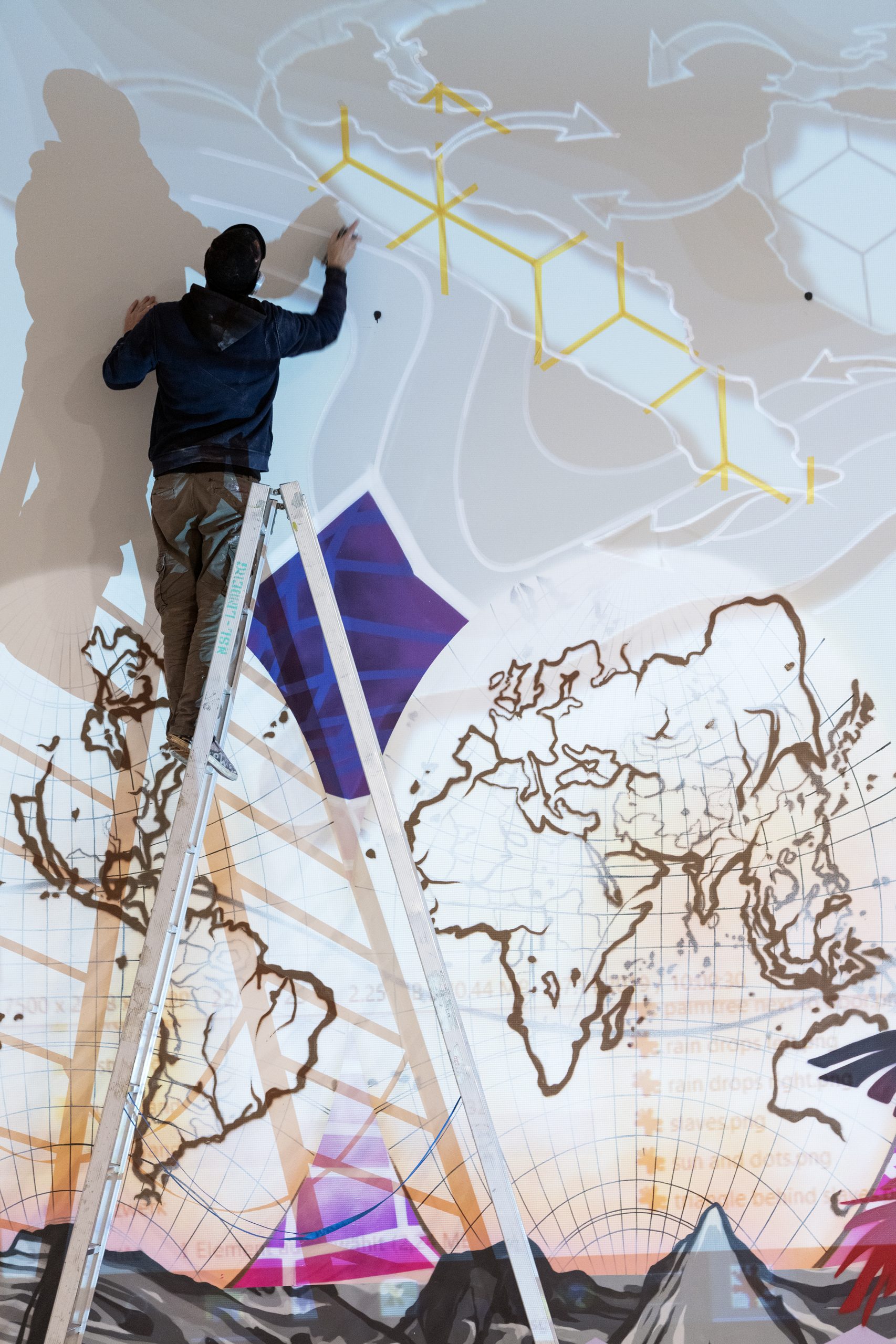 Insgesamt drei Wochen arbeitet das Urban Artists Duo How and Nosm an dem großflächigen Wandbild „Weltdenken“, das die Besucher*innen in die Berlin Ausstellung im Humboldt Forum einführen wird. Ein Teil des Wandbildes ist bereits fertig und wurde am Mittwoch der Presseöffentlichkeit vorgestellt.