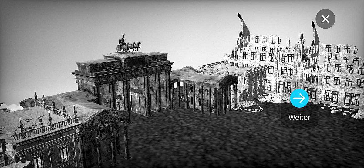Augmented-Reality-Technologie dient der virtuellen Erweiterung der Realität mit Hilfe von Smartphones oder Tablets. Diese Technologie liegt der App „Augmented Berlin“ zugrunde, die sich unter anderem dem Thema Leben im Untergrund widmet. Ausgehend vom zerstörten Pariser Platz startet die Zeitreise am 8. Mai 1945, springt kurz danach in das Jahr 1933 zurück um am Ende der Erzählung wieder im Jahr 1945 anzukommen. Die User*innen werden Zeug*innen der schrittweisen Verdrängung der Berliner Jüd*innen aus dem öffentlichen Leben bis hin zur Deportation ab 1941. Zwei Schicksale dienen als Hauptquelle: